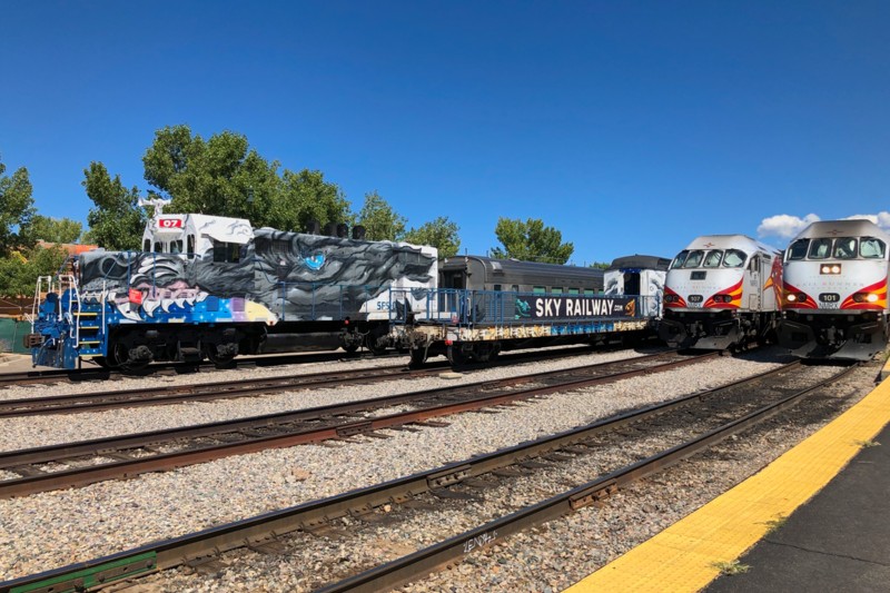 On the way to the museum, I watched the local Roadrunner leave the station and later saw the Sky Railway train pass through the neighborhood.