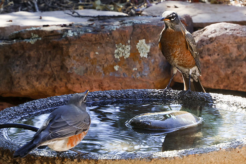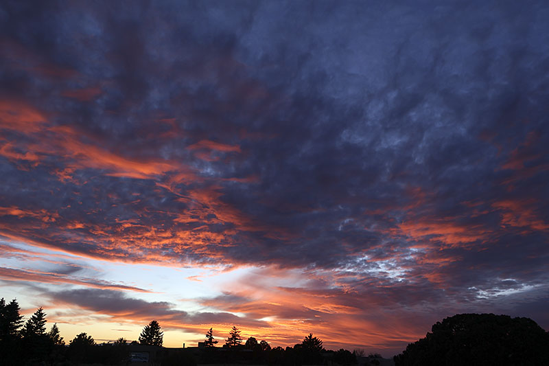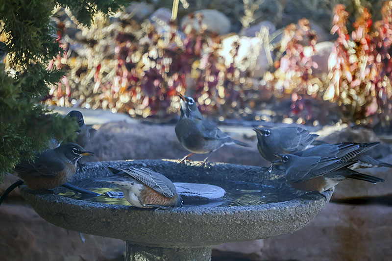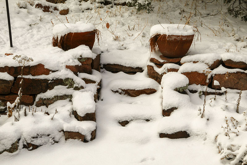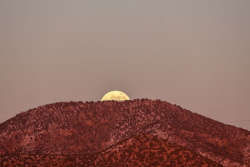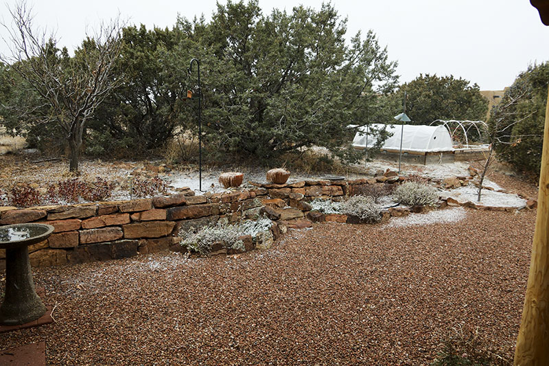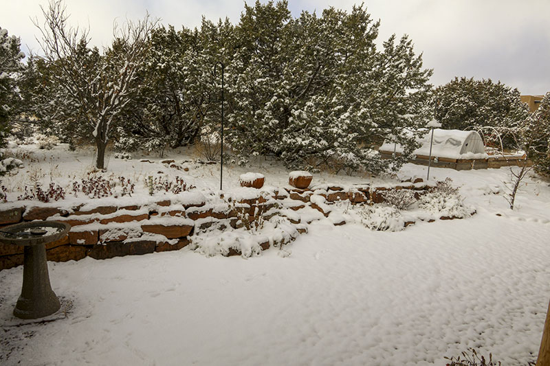Our warm dry weather held until the post-Thanksgiving sunset, then turned colder and delivered 2 inches of snow on Wednesday. The robins have been emptying the bird bath almost hourly and I spotted a rare red-winged blackbird at the feeder. Our old pumpkins were finally retired and tonight the Cold Moon rose over the Sangres.