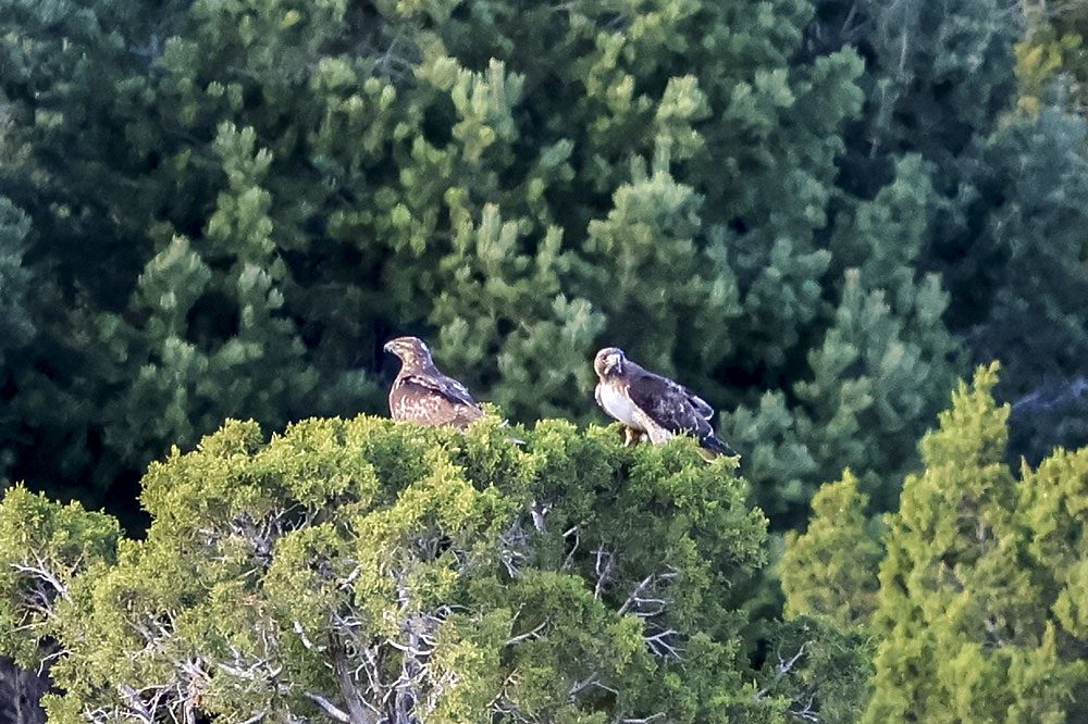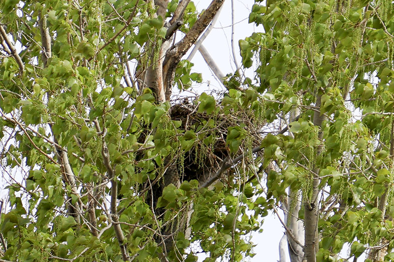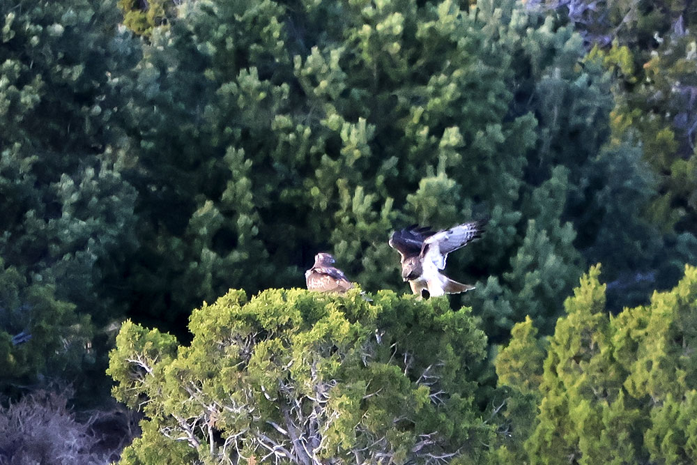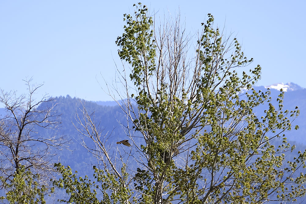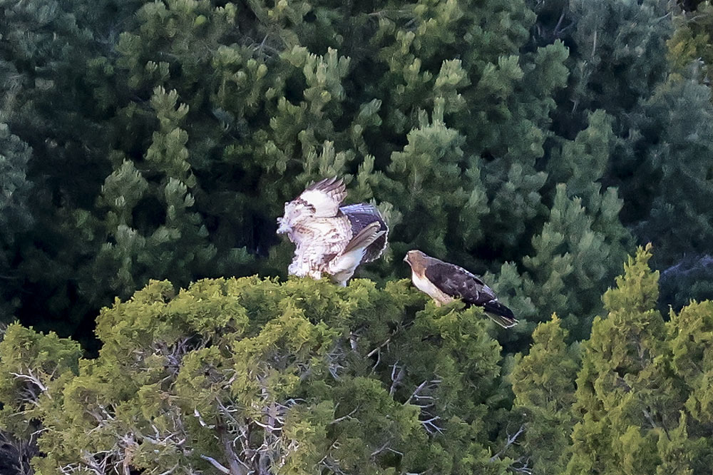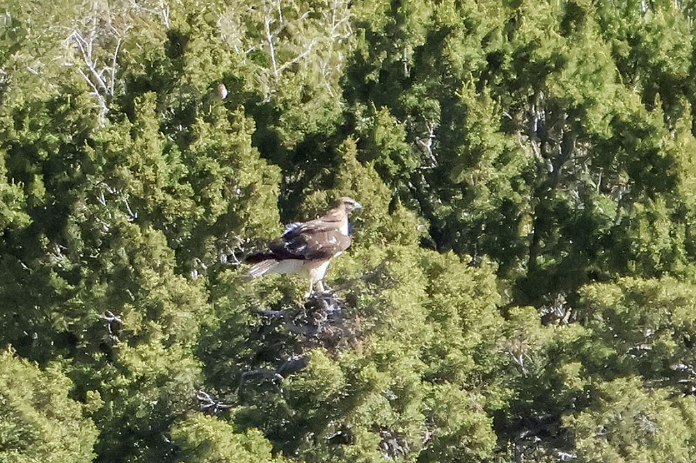 At the beginning of April, I noticed a pair of Red-tailed Hawks soaring above the greenbelt. I also spotted them sitting in the junipers, as well as carrying sticks up into a tall Aspen where they were building a nest (or maybe reinforcing an abandoned one). A week ago a storm moved in and we had a powerful micro-burst of wind. Since then, I haven’t seen them around the nest so they may have found another spot with more protection.